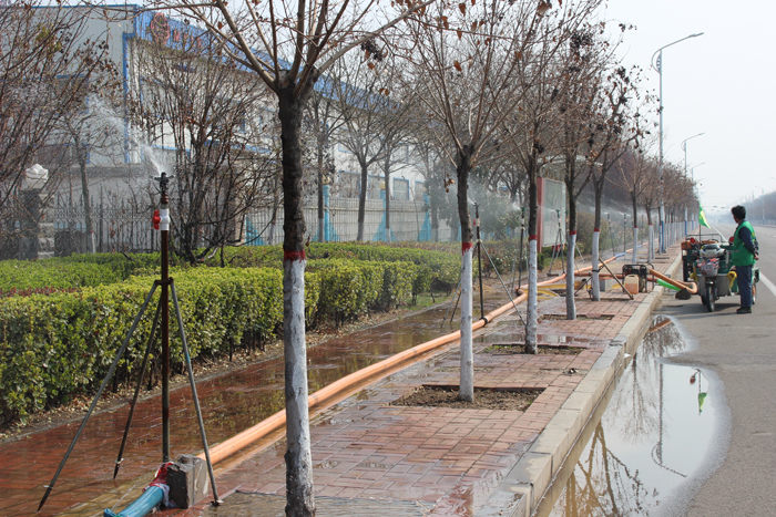 进入3月,气温逐步回升,苗木开始复苏萌芽,植物的需水量增加,金乡经济开发区调集人员设备迅速行动,及时为区内苗木植被浇灌返青水。